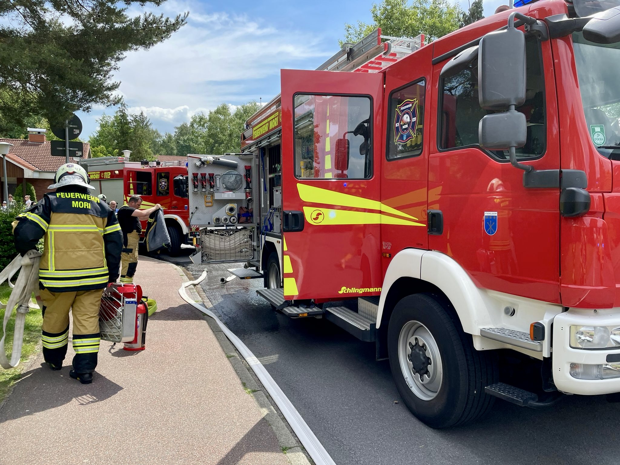 Bereits kurz nach dem Eintreffen bestätigte sich die Meldung und ein Angriffstrupp der Feuerwehr Mori ging über das Treppenhaus zur Brandbekämpfung vor.