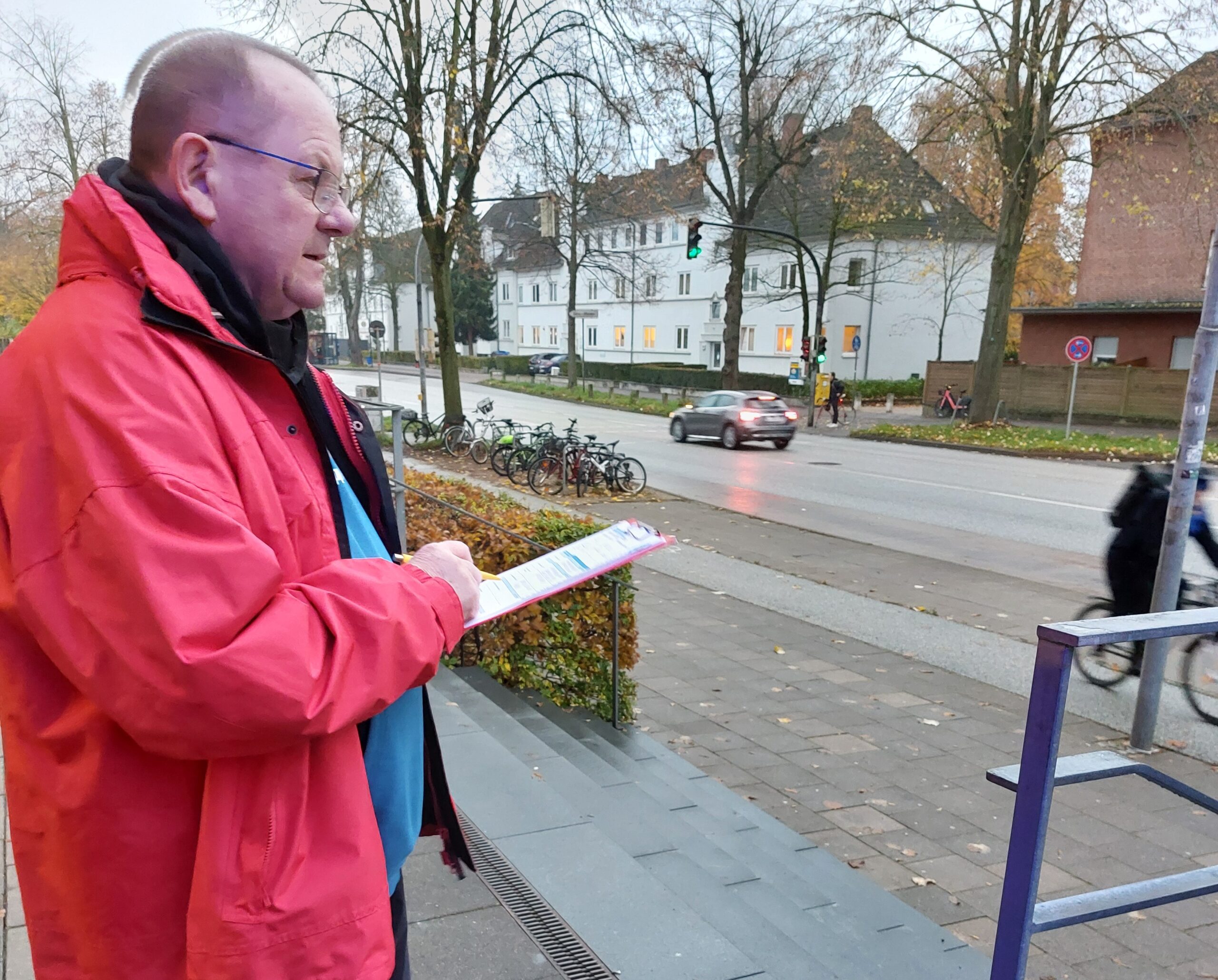 Nebel und frühe Dämmerung erschweren das Erkennen anderer Verkehrsteilnehmer. Im Rahmen der Aktion dokumentierten die ACE-Ehrenamtlichen Wolfgang Wenzel, Rüdiger Kleinert mit dem ACE Regionalbeauftragten Rüdiger Rohlf an drei verschiedenen Tagen den Zustand der Fahrradbeleuchtung an mehreren Standorten in Lübeck – am Gustav-Radbruch-Platz, in der Kronsforder Allee sowie Ratzeburger Allee/Mönkhofer Weg.